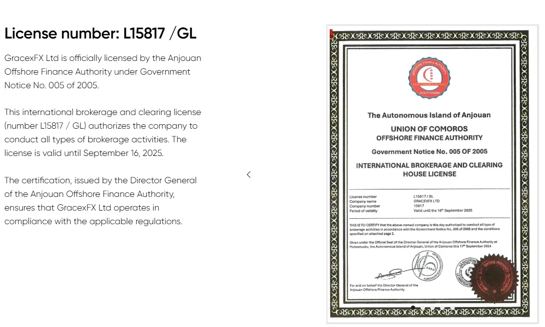 Gracexfx заявляет о наличии лицензии Anjouan Offshore Finance Authority, которая позволяет брокеру работать на международных рынках. Но что это значит для трейдера?